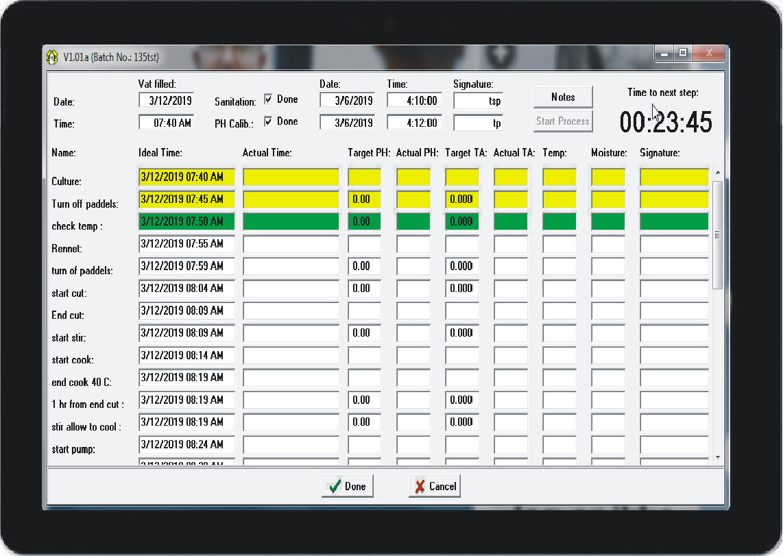 The CheeseCrafter® Total Production & Quality Management (TPQM) Software System provides cheese makers or managers of cheese manufacturing plants with a comprehensive system for getting control of the documents for their process and optimizing quality plus profitability. Data Entry is now possible via Interactive Data Entry both locally via the main PC or remotely via a Tablet which can be brought into the production floor. It is now also possible to do data entry on multiple vats simultaneously!